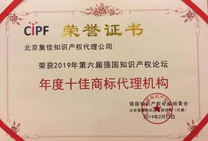 • 集佳獲2019第六屆強國知識產權論壇“十佳商標代理機構”榮譽稱號2月23日,由強國知識產權論壇組委會和北京強國知識產權研究院主辦的“2019強國知識產權論壇新春分享會暨服務業頒獎典禮”在北京大學博雅國際酒店舉行。集佳在本年度強國知識產權論壇服務業“十佳”評比中獲得“年度十佳商標代理機構”榮譽稱號,集佳合伙人趙雷律師參加會議并代表集佳領取榮譽證書...