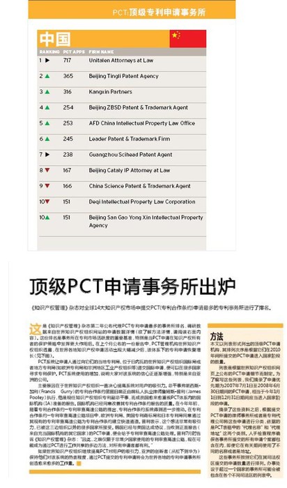 近日,全球知名知識(shí)產(chǎn)權(quán)雜志Managing Intellectual Property(MIP)公布了中國(guó)事務(wù)所的PCT(專(zhuān)利合作條約)申請(qǐng)排名,在申請(qǐng)日(優(yōu)先權(quán)日)介于2007年7月1日至2008年6月30日之間、30個(gè)月的絕限落在2010年1月至2010年12月間的已公開(kāi)的PCT申請(qǐng)中,集佳知識(shí)產(chǎn)權(quán)代理有限公司以717件申請(qǐng)?jiān)谥袊?guó)代理機(jī)構(gòu)排名中位列第一。