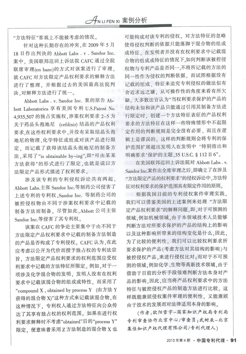 集佳代理人文章《從Abbott Lans.v.SandoZ Inc.案看方法限定產品權利要求的解釋》在《中國專利代理》發表