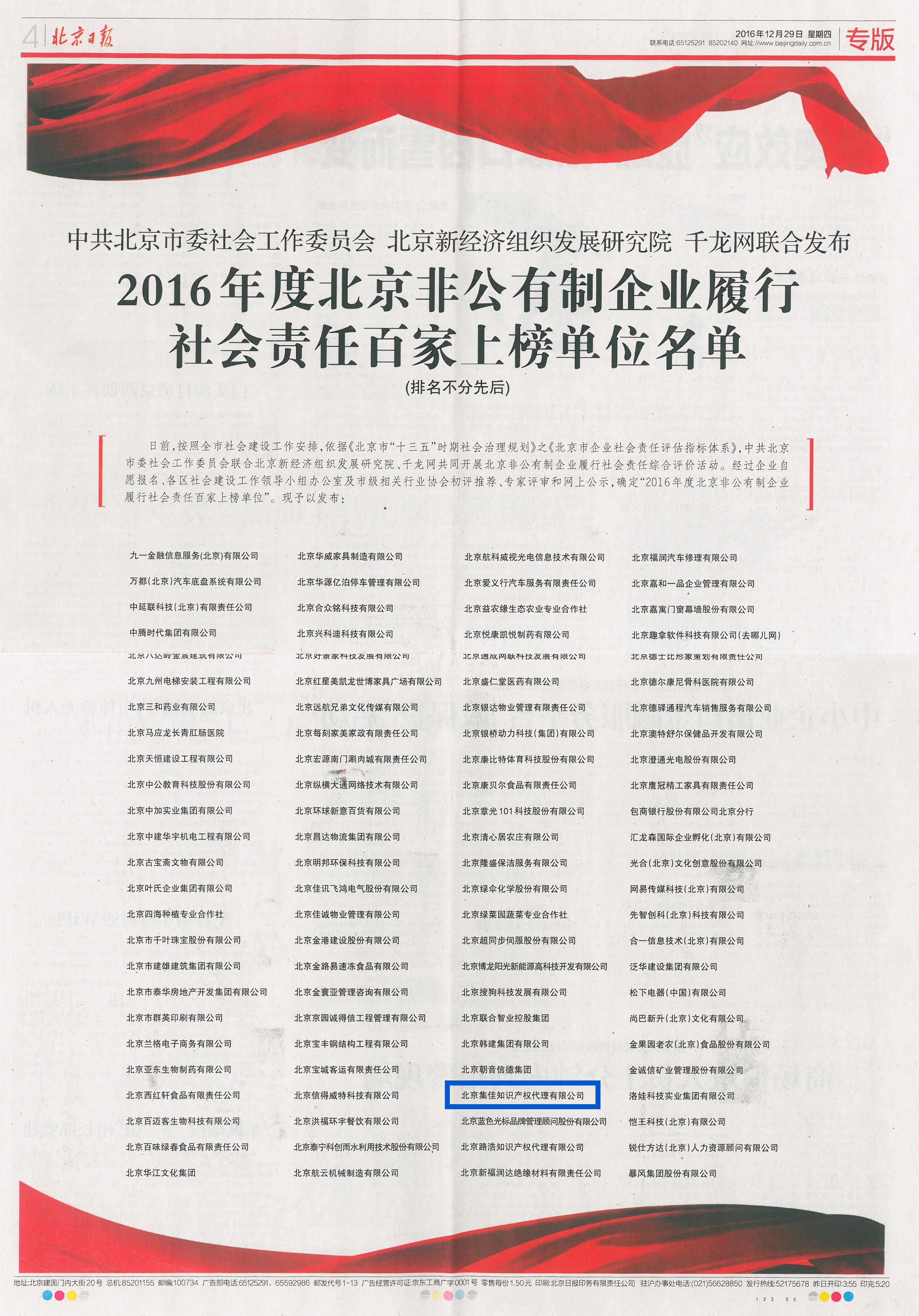 1月7日上午,由北京市委社會工委、北京新經(jīng)濟組織發(fā)展研究院、千龍網(wǎng)聯(lián)合組織的第二屆新經(jīng)濟組織發(fā)展高峰論壇暨首屆北京非公有制企業(yè)履行社會責(zé)任百家上榜單位發(fā)布會在首都經(jīng)貿(mào)大學(xué)隆重舉行,會上,北京集佳知識產(chǎn)權(quán)代理有限公司等100家履行社會責(zé)任表現(xiàn)突出的非公企業(yè)受到表彰。此前,《北京日報》整版刊發(fā)了百家上榜企業(yè)名單。