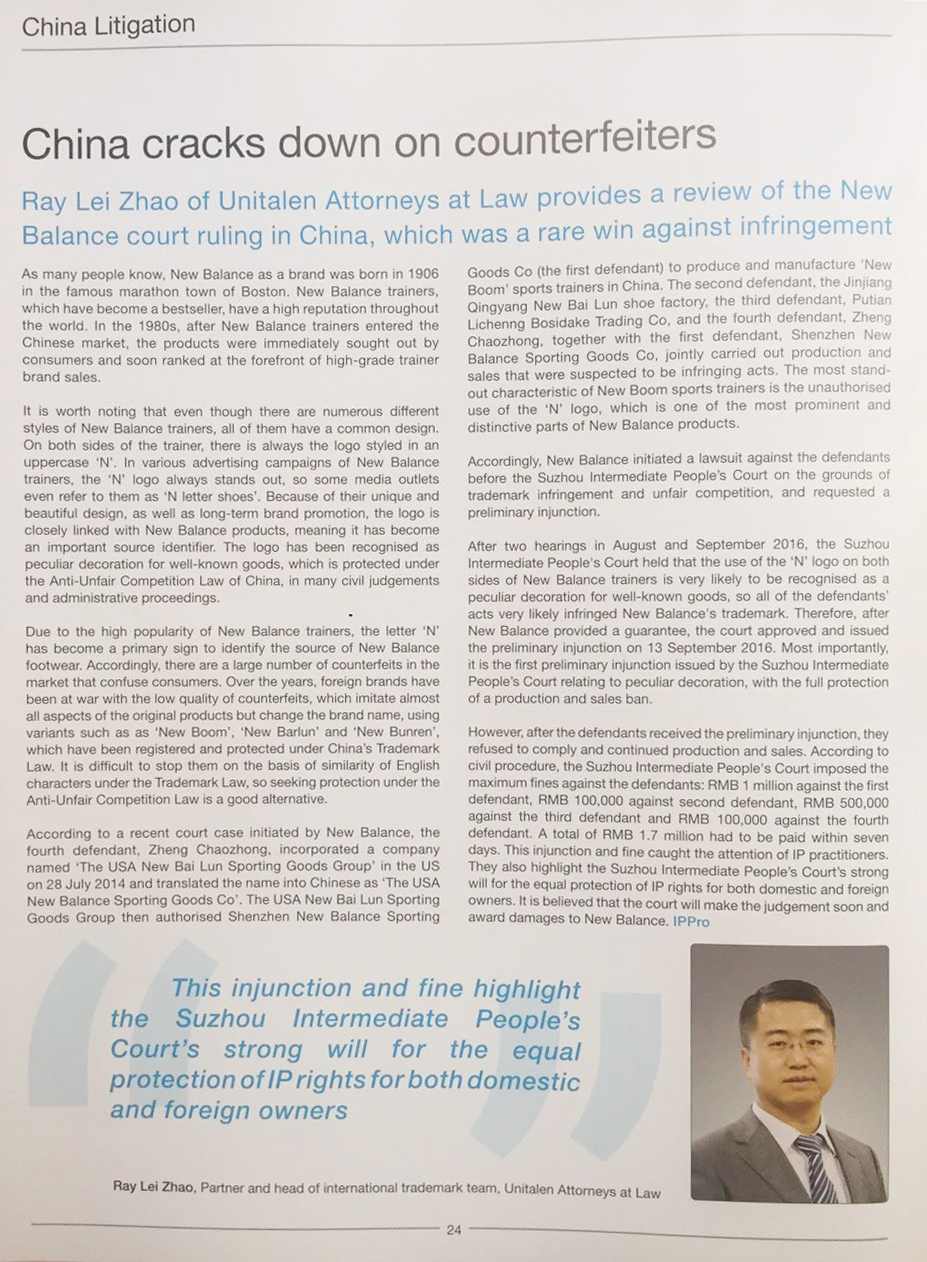 Ray Lei Zhao of Unitalen Attorneys at Law provides a review of the New Balance court ruling in China, which was a rare win against infringement