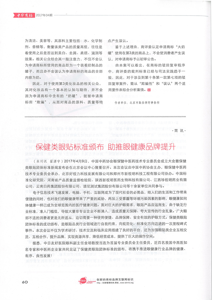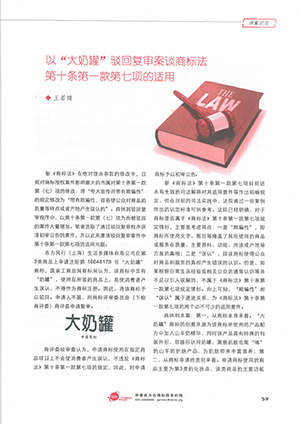 集佳文章《以“大奶罐”駁回復(fù)審案談商標(biāo)法第十條第一款第七項(xiàng)的適用》在《中華商標(biāo)》發(fā)表