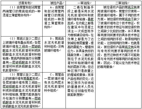 首先,權(quán)利要求明確記載筒管玻璃纖維布層數(shù)為“不少于二層”,實(shí)際上該限定本身已排除一層的實(shí)現(xiàn)方式。其次,還應(yīng)當(dāng)注意說明書對于權(quán)利要求的解釋作用對等同特征認(rèn)定的約束作用,客觀上,涉案專利說明書明確記載了“可以少到僅兩層”,并基于此強(qiáng)調(diào)其技術(shù)效果。 因此,在等同特征判斷時,不應(yīng)當(dāng)再將權(quán)利要求限定已經(jīng)排除的一層的實(shí)現(xiàn)方式認(rèn)定為“不少于二層”的等同特征,以有效平衡社會公眾的權(quán)益。 此外,該案二審判決體現(xiàn)了另外一個觀點(diǎn):由于早于本案專利發(fā)明存在著筒底及筒管組成混凝土薄壁筒體構(gòu)件的公知技術(shù),所以,被控侵權(quán)物在筒管上使用一層玻璃纖維布更接近于公知技術(shù)。沿用與公知技術(shù)相近似的技術(shù)方案,屬于公眾的權(quán)利。盡管該觀點(diǎn)與等同特征的判斷無直接關(guān)聯(lián),但在該判決中進(jìn)一步依職權(quán)從現(xiàn)有技術(shù)抗辯的角度進(jìn)行了評述,無疑為事實(shí)認(rèn)定提供了另一維度的支撐。