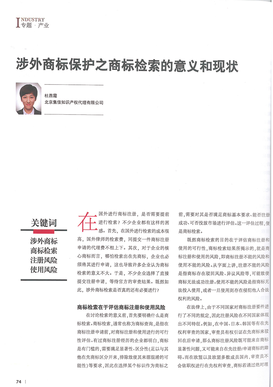 集佳文章《涉外商標(biāo)保護之商標(biāo)檢索的意義和現(xiàn)狀》在《中國知識產(chǎn)權(quán)》發(fā)表