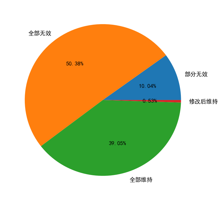 本次共收集專利無效宣告請求審查決定30178篇(至少有部分關鍵數據有效,包括2008年之前案件),其中宣告專利權全部無效(下簡稱全部無效)的決定15203篇,占比50.4%,宣告專利權部分無效(下簡稱部分無效)的決定3031篇,占比10.0%,宣告維持專利權有效(下簡稱全部維持)的決定11783篇,占比39.0%,在修改的基礎上維持專利權有效(下簡稱修改后維持)的決定161篇,占比0.5%。可見,在超過60%的無效宣告請求中,都有至少部分權利要求被宣告無效。