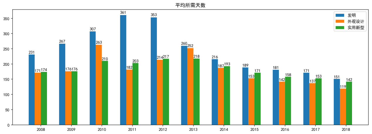 (2)無論在哪一個年度,發明專利的耗時都要比其它二者更長;一般情況下,外觀設計專利用時最短。