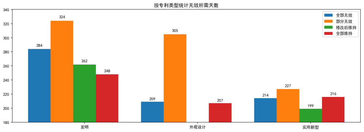 上圖為按專利類型統計的無效請求作出決定平均所用天數。總體上看,發明專利無效決定的用時要多于外觀設計專利和實用新型專利,其中,每一類型下都是部分維持的決定耗時最久。這可能是由于與全部維持或者全部無效相比,部分維持的案件可能相對更加復雜,更難以作出決定。