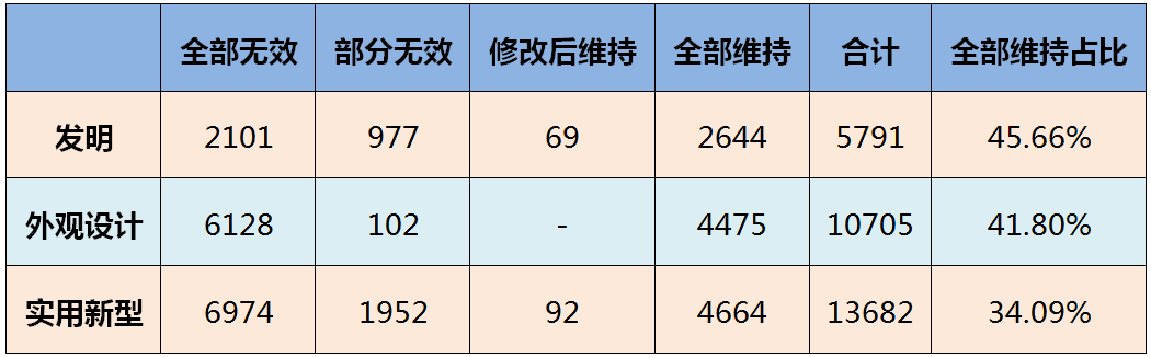 上表為按專利類型統計的各種情況的案件數量。總體上看,發明專利宣告維持的比例要遠高于外觀設計專利和實用新型專利,即專利被宣告無效的概率從發明專利到外觀設計專利再到實用新型專利是逐步增加的,這也與我們一般的認識相符。某種程度上,實用新型專利的低穩定性,大幅增加了專利整體被宣告無效的比例。