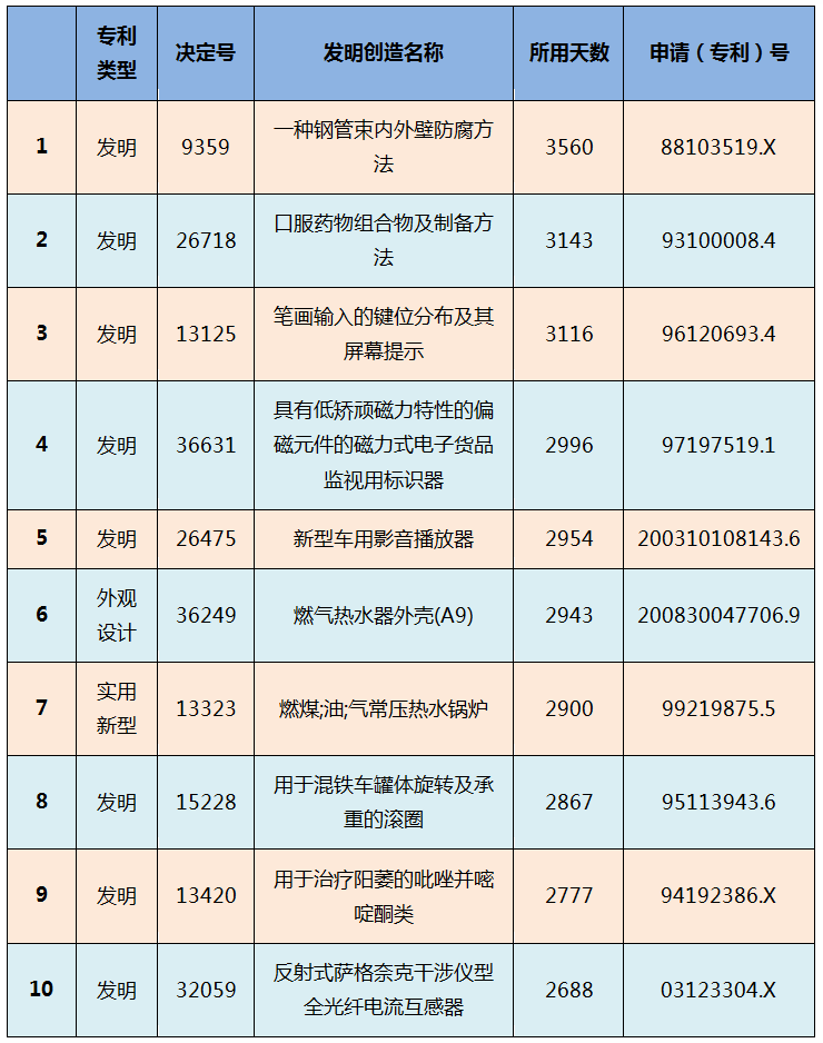 另外,上述總體平均用時與一般經驗相比明顯過長。對此,筆者統計了用時最長的決定,初步可以判斷用時較長(例如超過1年)的案件均涉及一次或者多次行政訴訟,因此耗時較長。其中前10個耗時最長的決定列表如下,以供參考: