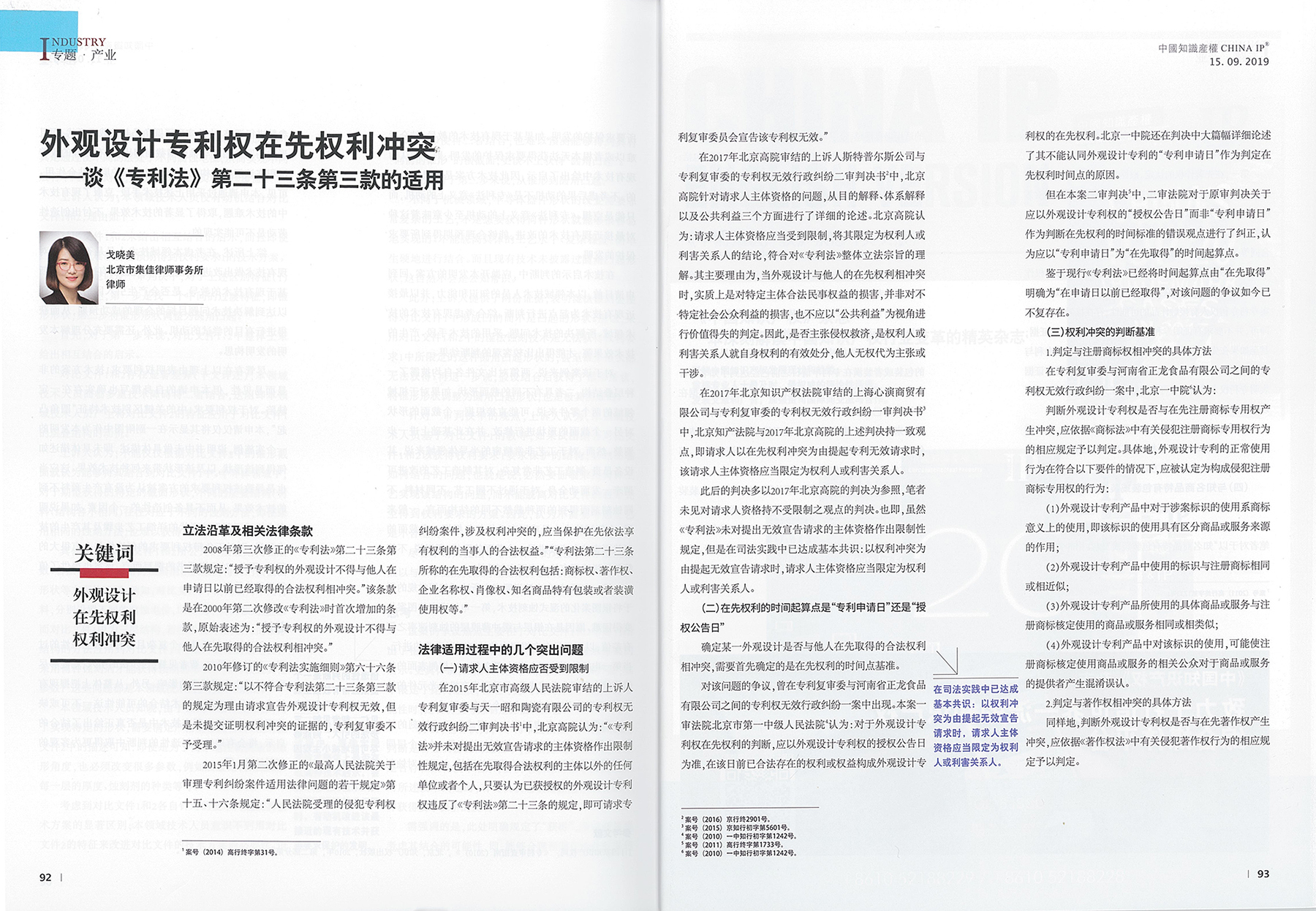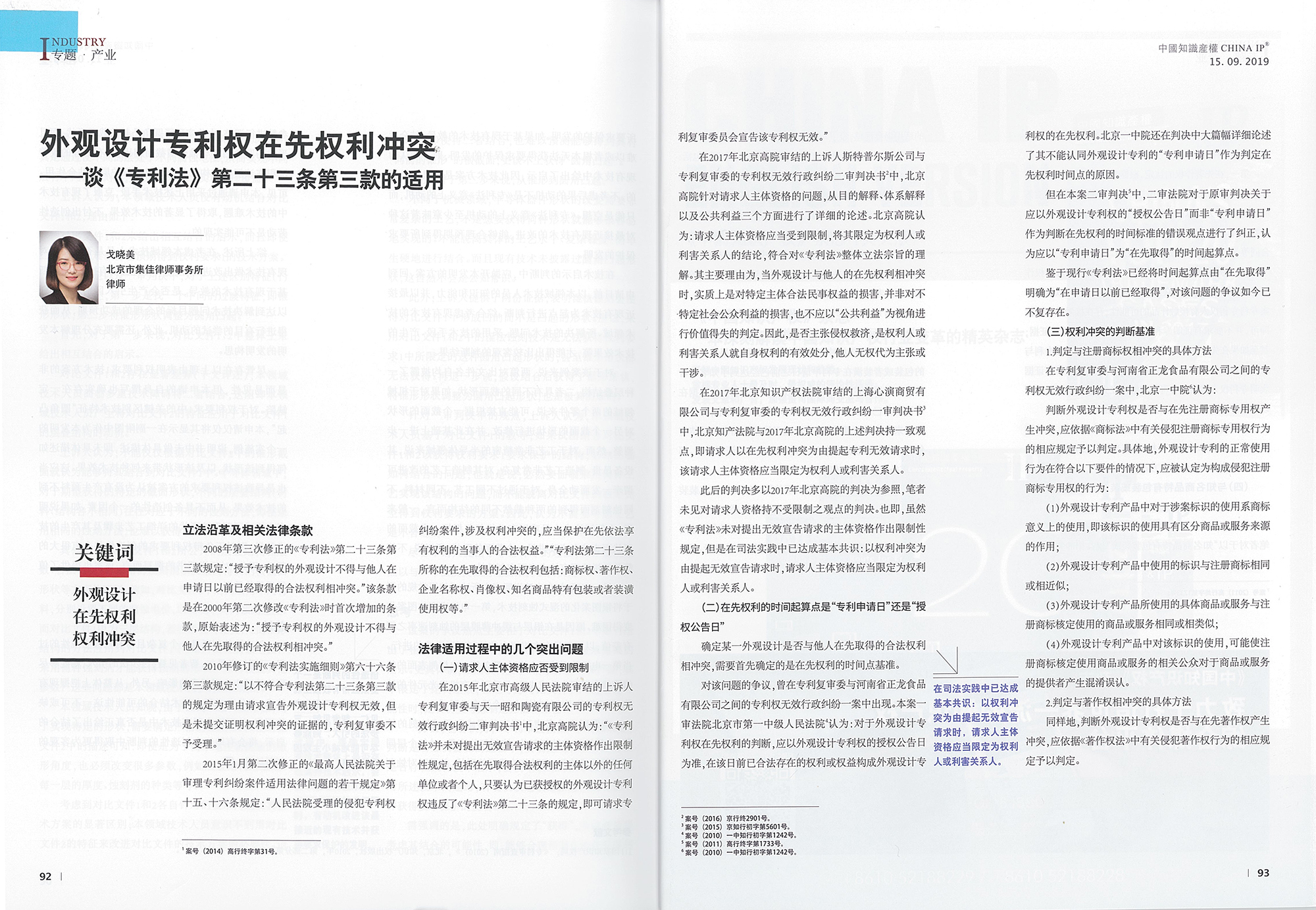 集佳文章《外觀設計專利權在先權利沖突——談<專利法>第二十三條第三款的適用》在《中國知識產權》 發表
