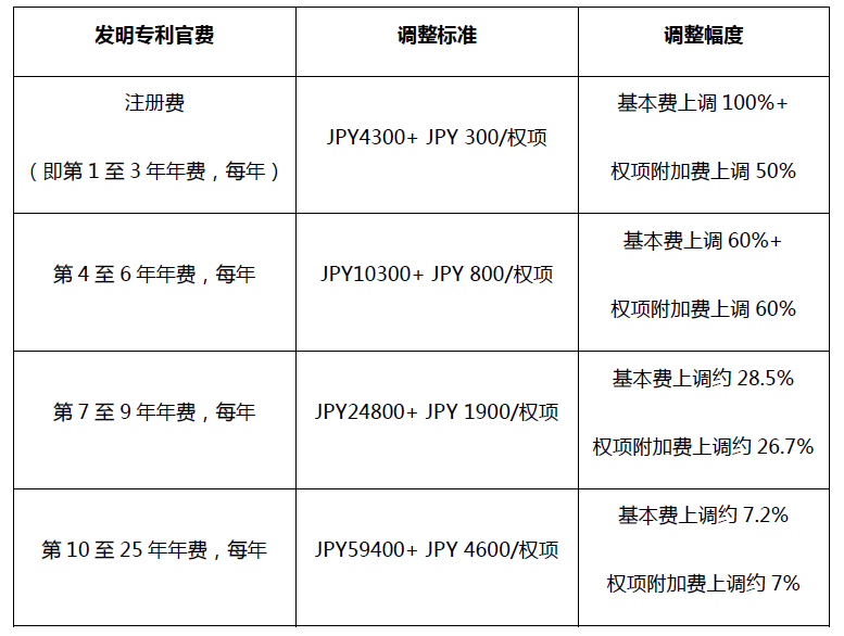 日本專利局每2-3年會對官費進行一次調整,并在每年4月1日生效實施。本次將于2022年4月1日生效實施的官費主要是發明專利的注冊費和年費,具體調整如下: