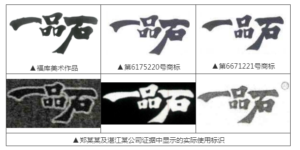 2007年7月,廣東省湛江市居民鄭某某在“電壓力鍋”等廚房器具商品上申請注冊第6175220號“一品石”商標,并于同年8月成立湛江市某公司。2008年4月,鄭某某又申請注冊另一枚第6671221號“一品石”商標,該枚商標的字形與前一枚商標略有變化,著作權圖樣及涉案相關標識如下附圖所示: