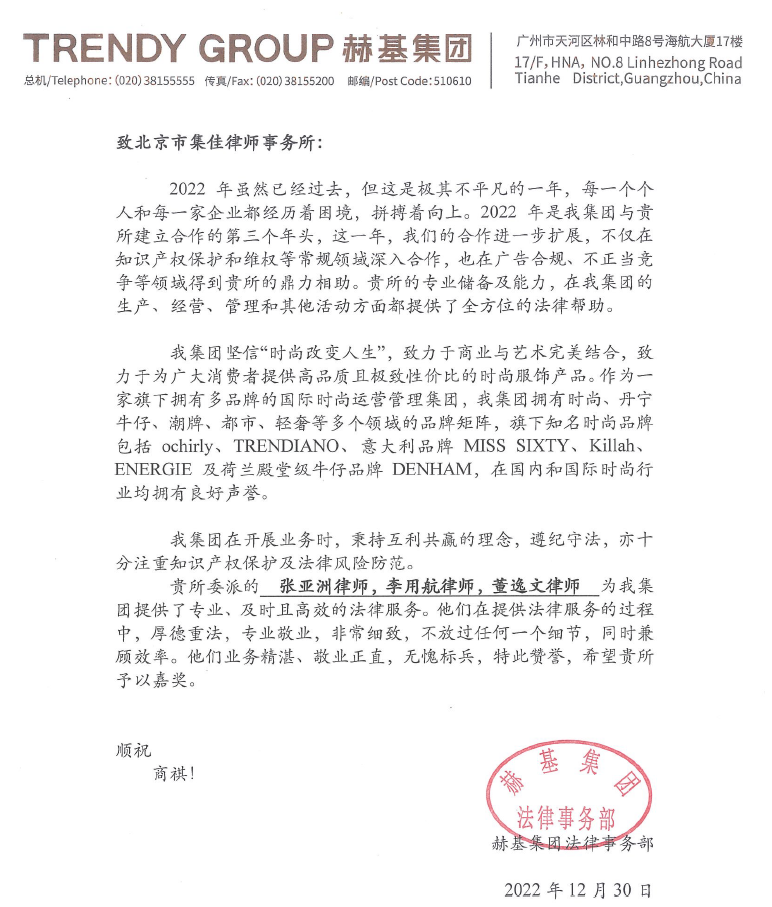 新年伊始,集佳收到來自客戶赫基集團的暖心表揚信,信中對集佳在知識產權保護和維權、廣告合規、不正當競爭等領域的優質服務、精湛業務給予高度認可,并對張亞洲、李用航、董逸文、常寶亮、代健、馬偉風等集佳專業人員認真負責的工作態度致以高度贊譽,稱贊他們在提供法律服務的過程中,厚德重法,專業高效,敬業正直,無愧標兵!