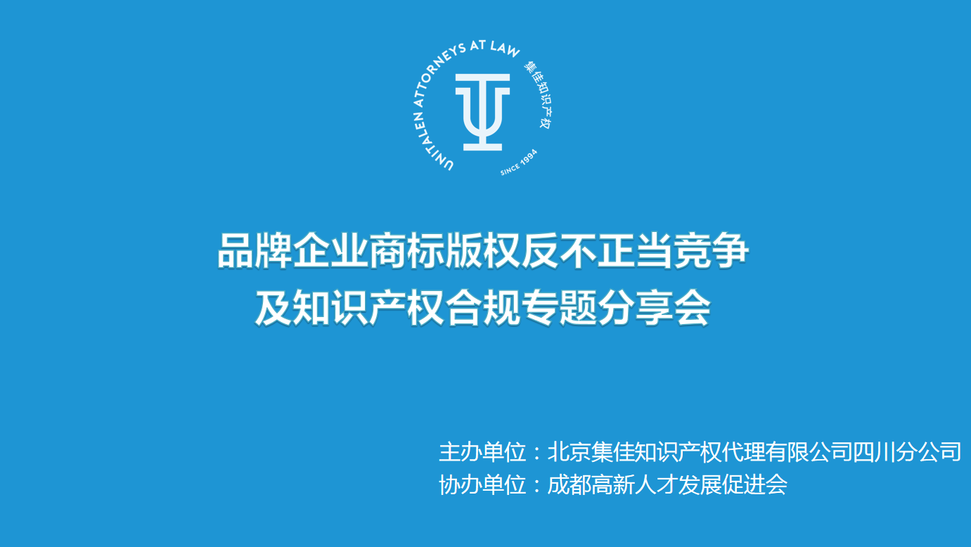 5月26日,由北京集佳知識產權代理有限公司四川分公司主辦、成都高新人才發展促進會協辦的“品牌企業商標版權反不正當競爭及知識產權合規”專題分享會在世紀城新會展中心順利舉辦。
