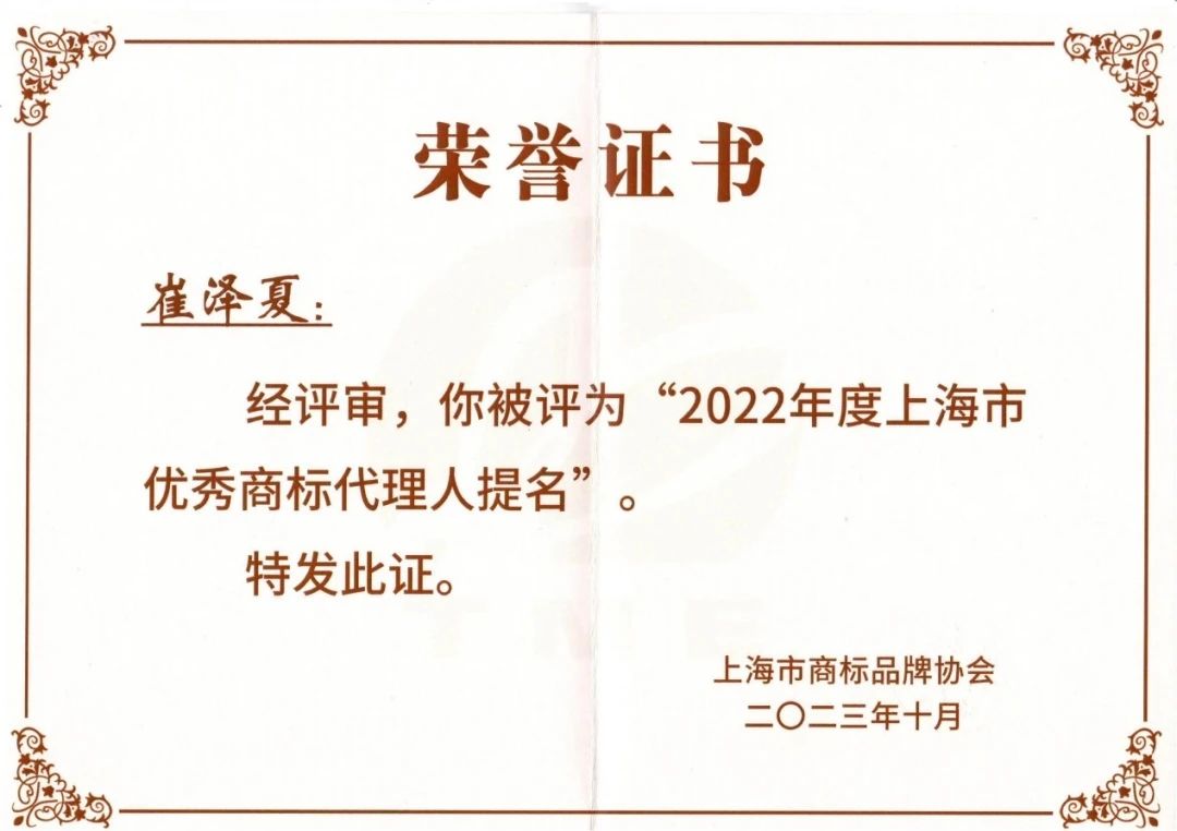 集佳上海分所崔澤夏律師獲得2022年度“上海市優秀商標代理人提名”。