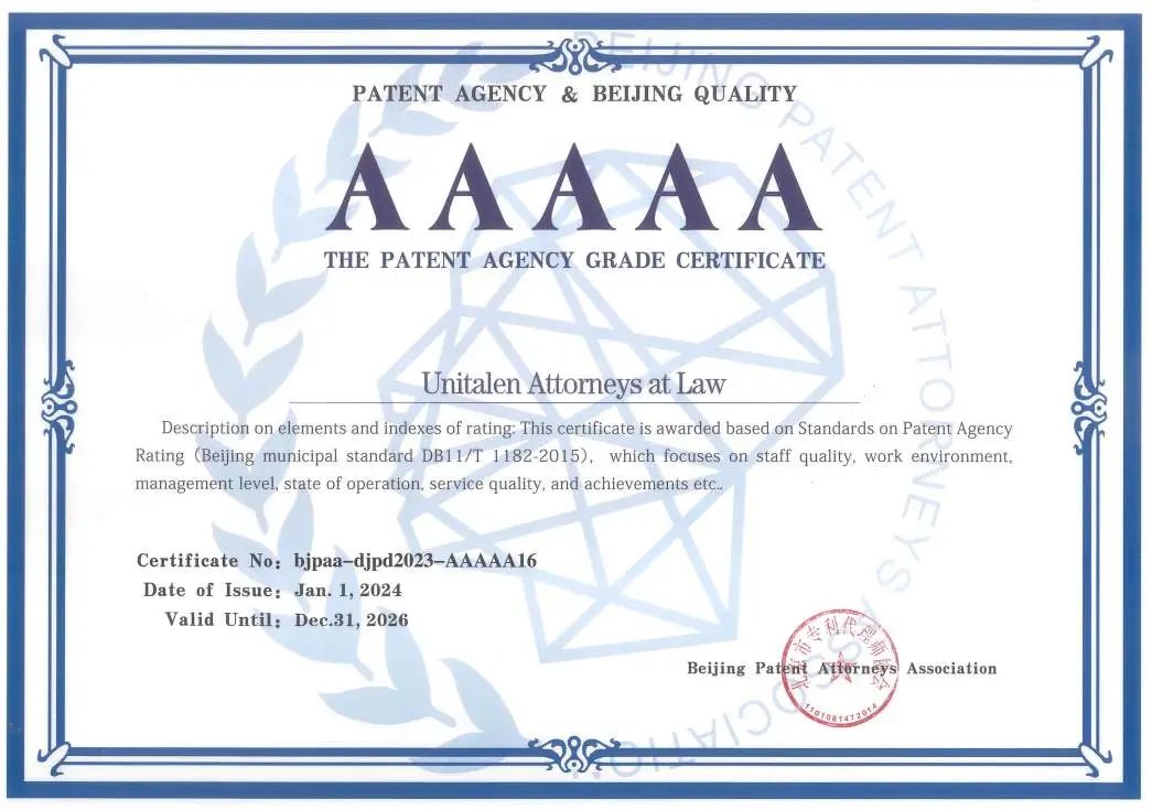 Recently, the Beijing Patent Attorneys Association released the 2023 patent agency rating results. Unitalen Attorneys at Law was recognized by all sectors for its stable comprehensive strength and was once again awarded the highest level, the AAAAA Patent Agency.