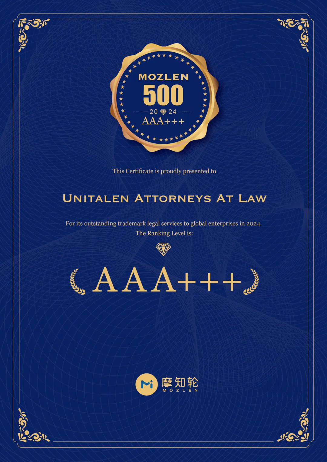 Unitalen Selected into "MOZLEN 500" Top 10 of China Professional Foreign-related Trademark Agencies in 2024 with Ranking Level of "AAA+++"
