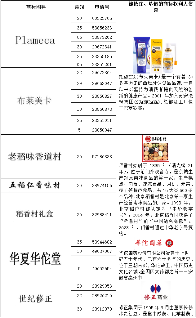 在分析系爭商標申請人申請注冊商標之時,需要對其申請的商標進行逐一分析、比對,并闡述說明被搶注的商標的真實權利人的情況,并提供參考證據。如第23851064號“WEALTHY HEALTH”商標無效宣告案(系爭商標申請人共申請156件商標)中,代理人發現該商標申請人北京鑫鵬福元商貿有限公司申請的多件商標與其他具有強顯著性和知名度的商標相同或者近似,且被搶注的商標的真實權利人根據查詢均可以一一對應。通過列表,這些系爭商標申請人搶注他人的情況可以很清晰的展示出來。