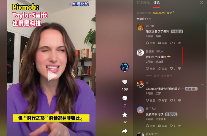 本案中,系爭商標被系爭商標申請人申請在第11類商品上,同時系爭商標申請人同時也生產發光手環商品,與申請人處于同一商業領域。系爭商標申請人僅申請了9枚商標,數量較少。在調查系爭商標申請人行動之時,代理人發現系爭商標申請人的關聯公司在抖音社交媒體關于國際巨星、歌手Taylor Swift(泰勒斯威夫特)的演唱會上使用申請人的PIXMOB發光手環的視頻下面(見下圖),主動聲稱該手環為其公司生產制造。代理人立刻對該證據進行了固定。