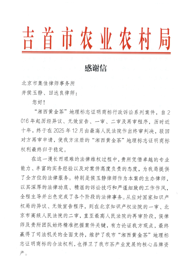 近日,集佳收到來自湖南省吉首市農業農村局的感謝信,“湘西黃金茶”地理標志證明商標行政訴訟系列案件歷時近十年,終于在吉首市農業農村局與集佳律師團隊的共同努力下畫上了圓滿的句號。信中,吉首市農業農村局對集佳律所及侯玉靜、田達良律師們的專業水準和精致服務給予高度評價!